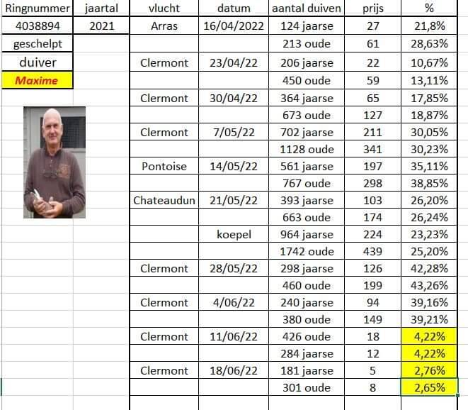 Hij laat mij weten dat hij er goeie uit heeft en stuurt mij uitslagen door van een duivin die opeens toppers begint te vliegen na een reeks mooie prijzen tot op de halve fond . Ik denk dat hij een beetje te hoog gegrepen had en ontdekte dat die duiven niet geschikt zijn voor Chateaudun .