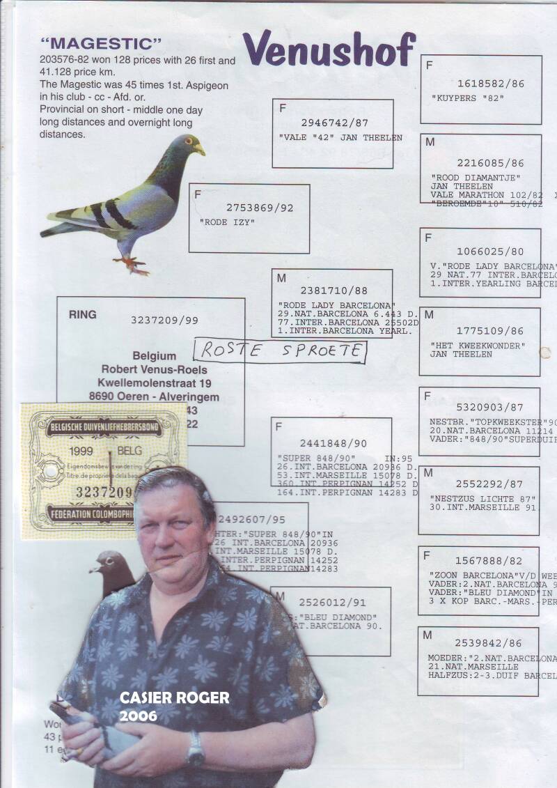 Zie hieronder ook een " verse " stamboom , geplukt van een verkoopsite , van een te koop aangeboden duif van MIJN soort , waarin nog een beetje Theelen zit .